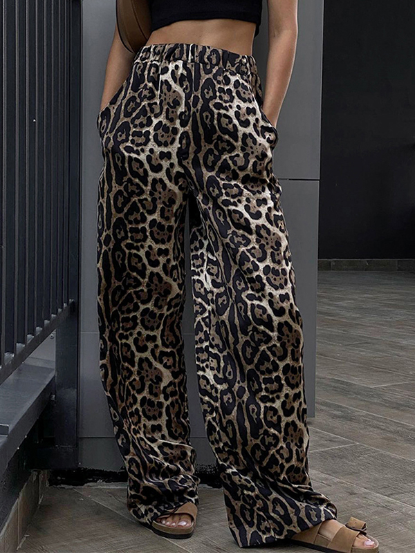 Pantalones anchos elásticos de tiro medio con estampado de leopardo