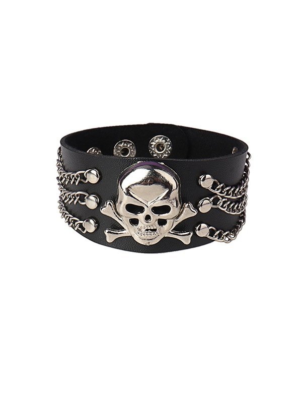Pulsera de piel sintética gruesa con calavera adornada con cadena