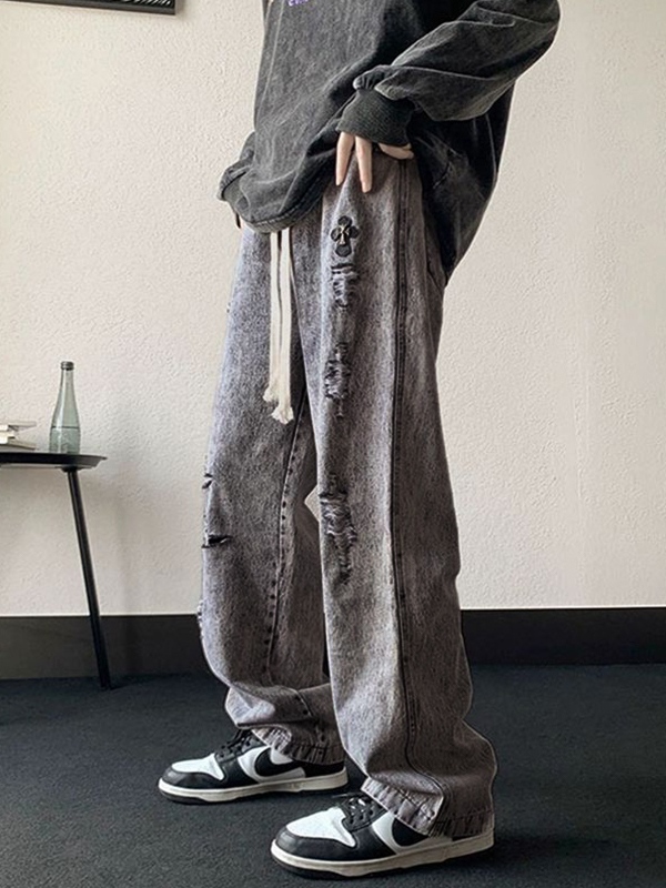 Vaqueros holgados con cordón rasgado y lavado gris para hombre