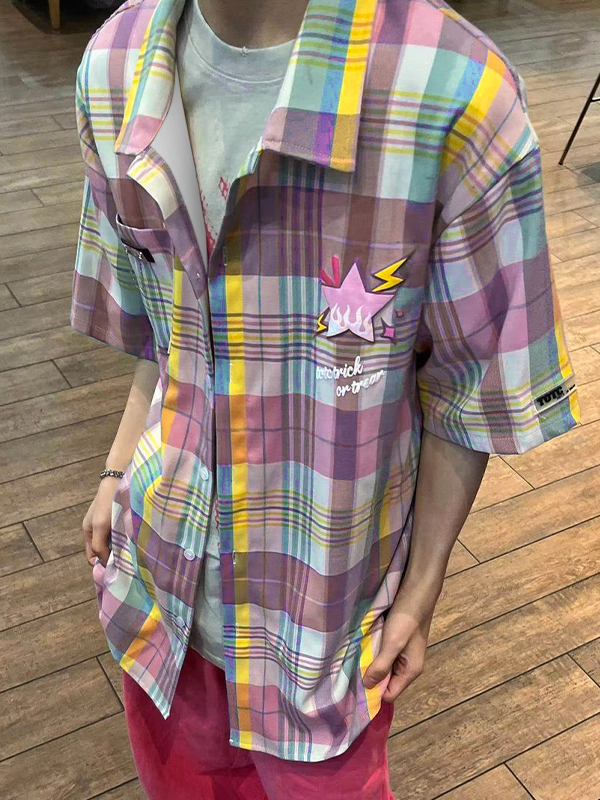 Blusa de manga corta con estampado de cuadros coloridos vintage para hombre